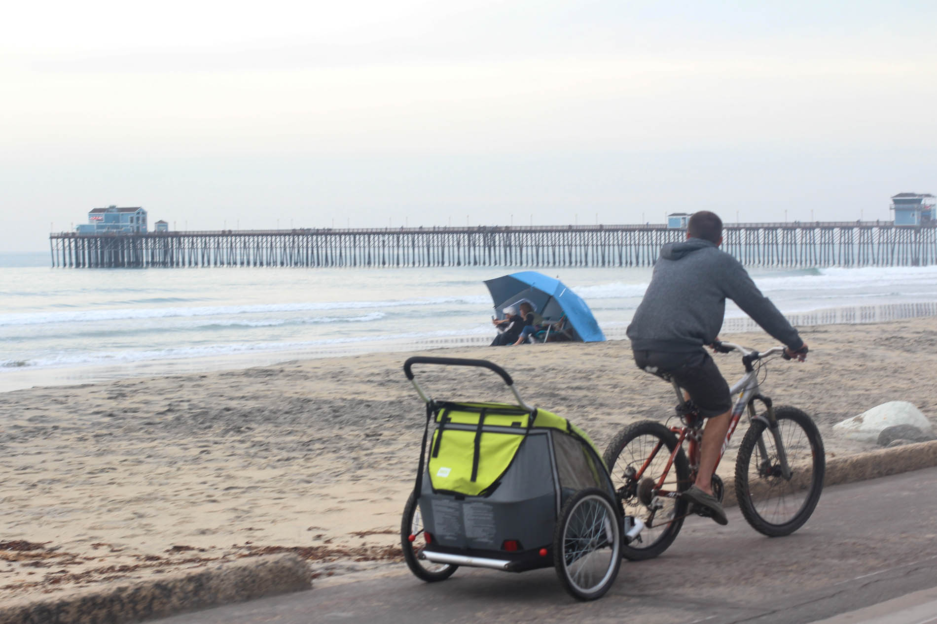 One cloudy day, too cold for the beach, we decided to take the bikes down to “The Strand” for an afternoon ride. Rylie loves to cruise around in her chariot of style (pulled behind Josh on his bike), and since we just bought it this fall, we basically missed the whole summer worth of opportunity to use it. No time like the present. Enroute, and on arrival, we watched some surfing, Rylie conquered the playground (up and down the stairs and slides all on her own this time), dirtied her pants with playground wetness, and filled her little suede shoes with sand. I had to pry her proud lips off the beach when it was time.