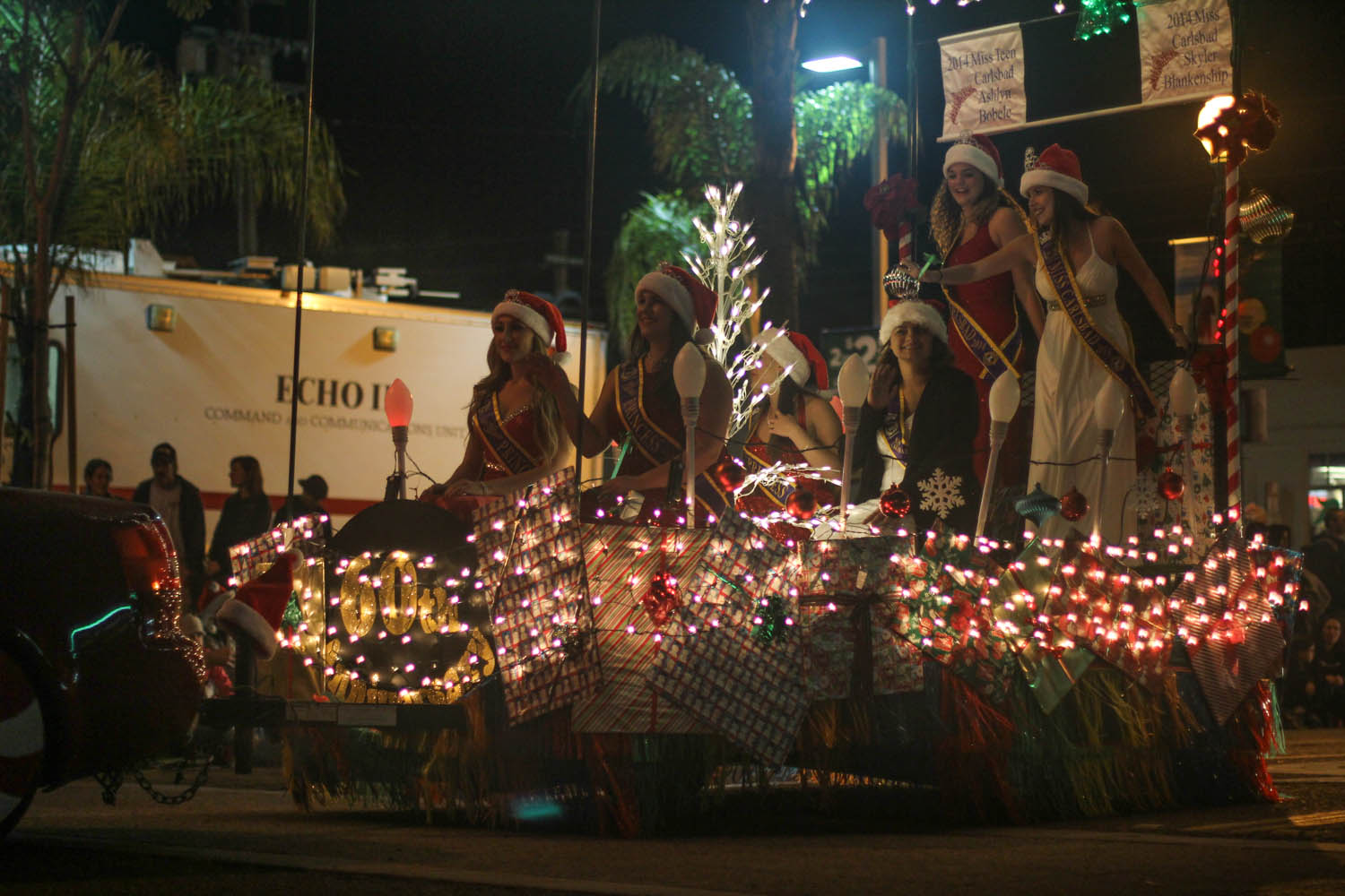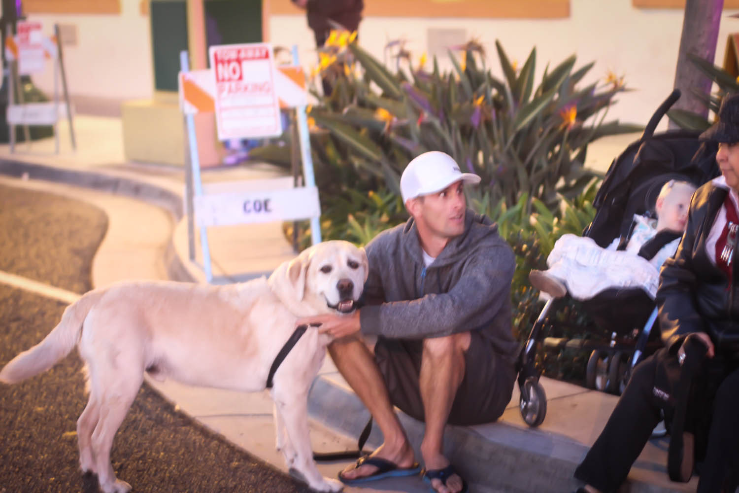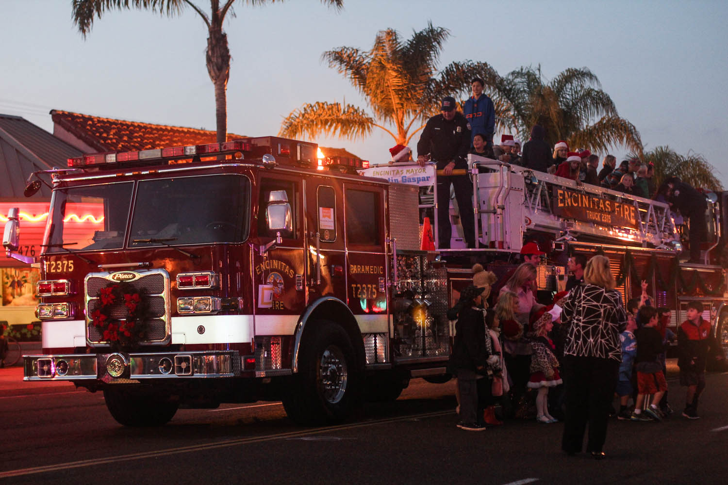 From the dog park we went straight to downtown Encinitas to pull up a crumb of curb before the parade started. It was already really busy, so we parked a good jaunt away, and found a nice corner of real estate at the very beginning of the route. It was an interesting experience for a couple of reasons. One, it was dark. Two, we had our goofy dog along. And three, I was trying to feed Rylie the most simplest real meal I could find at last minute (a chicken quesadilla) and feed her in the stroller with him drooling all over the place, standing and sticking his butt in a nearby child’s face trying to look cute for a wee little taste. Oh Nixon.
