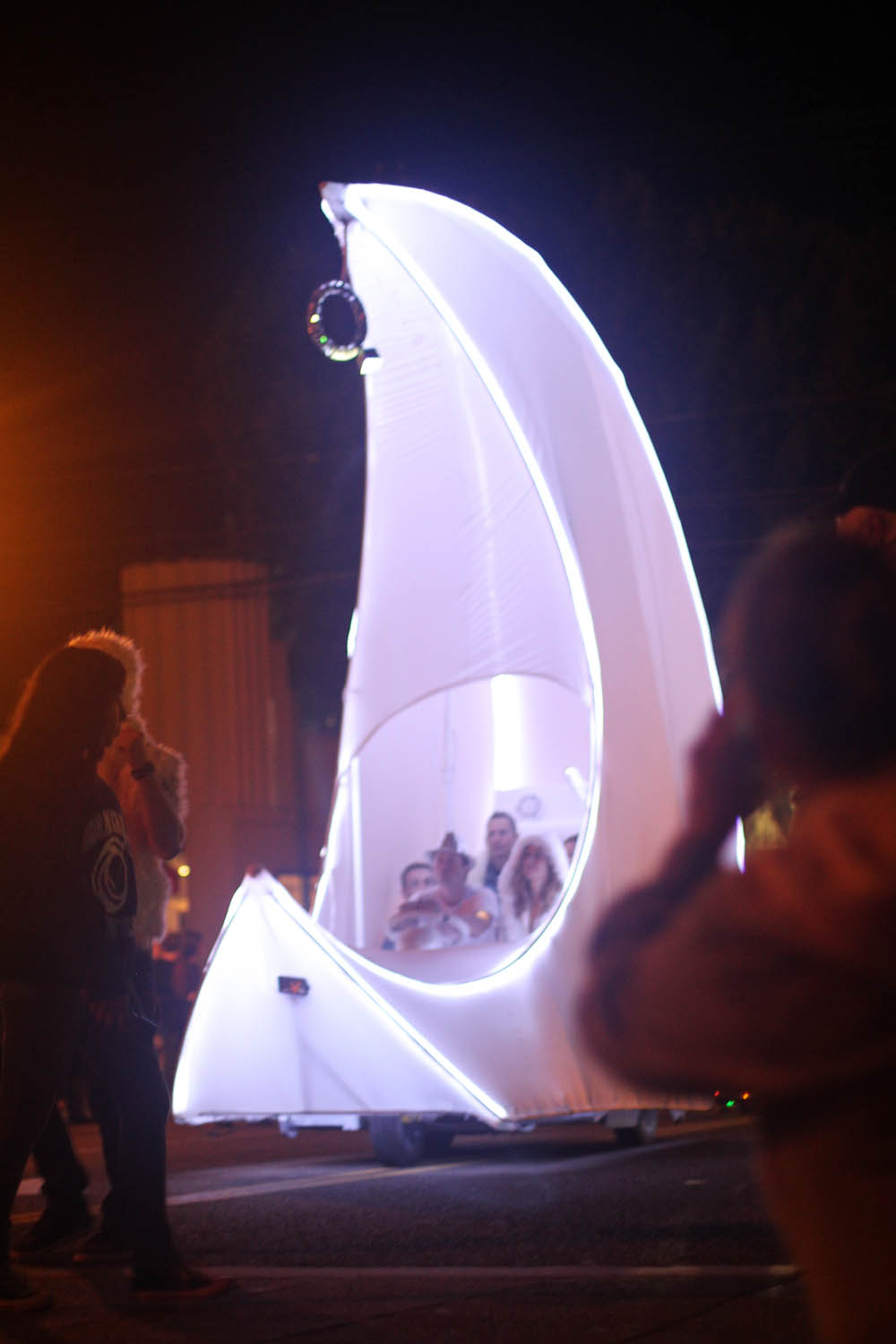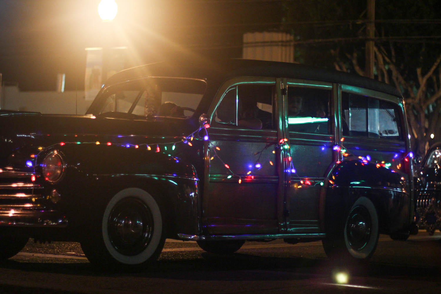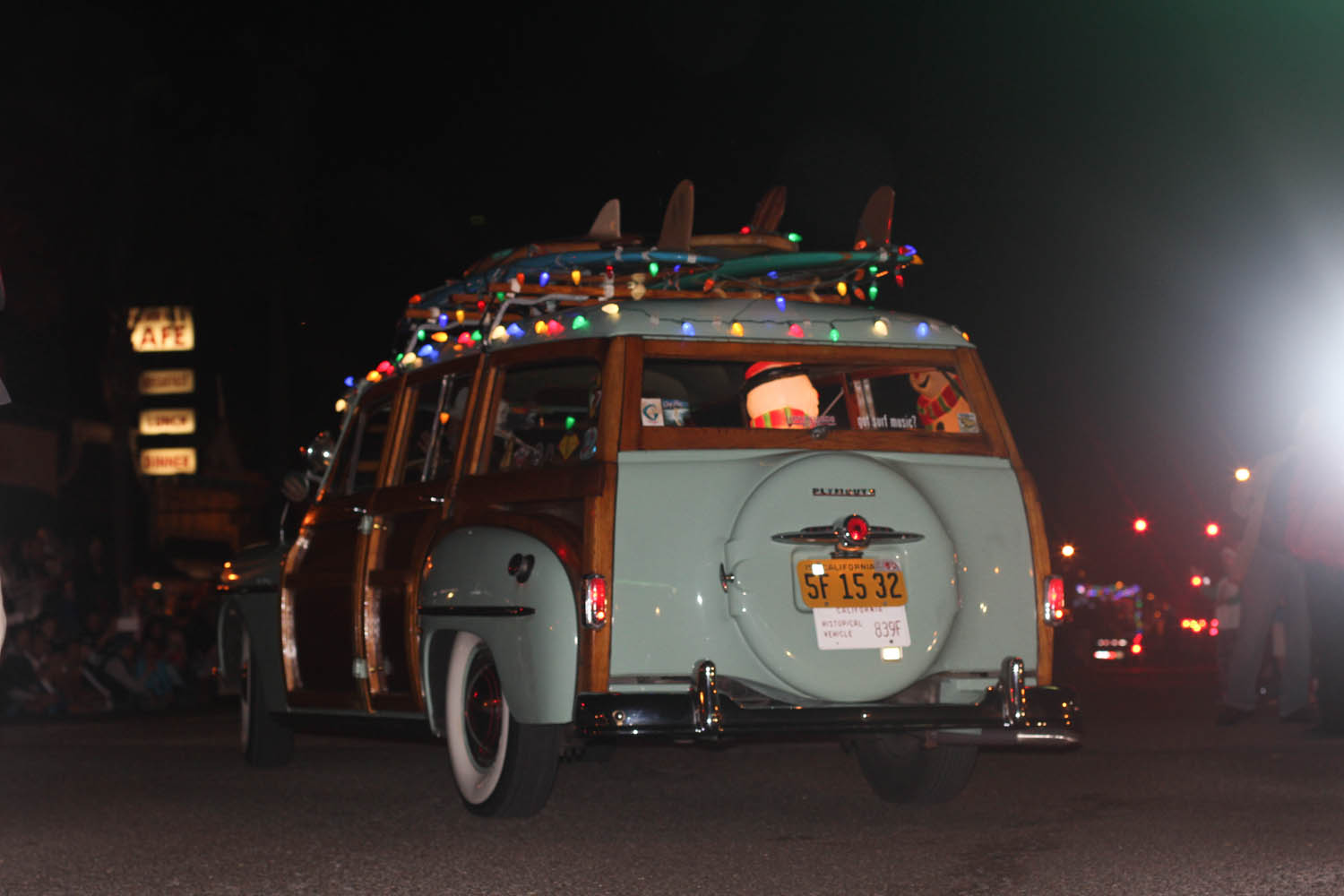 From the dog park we went straight to downtown Encinitas to pull up a crumb of curb before the parade started. It was already really busy, so we parked a good jaunt away, and found a nice corner of real estate at the very beginning of the route. It was an interesting experience for a couple of reasons. One, it was dark. Two, we had our goofy dog along. And three, I was trying to feed Rylie the most simplest real meal I could find at last minute (a chicken quesadilla) and feed her in the stroller with him drooling all over the place, standing and sticking his butt in a nearby child’s face trying to look cute for a wee little taste. Oh Nixon.