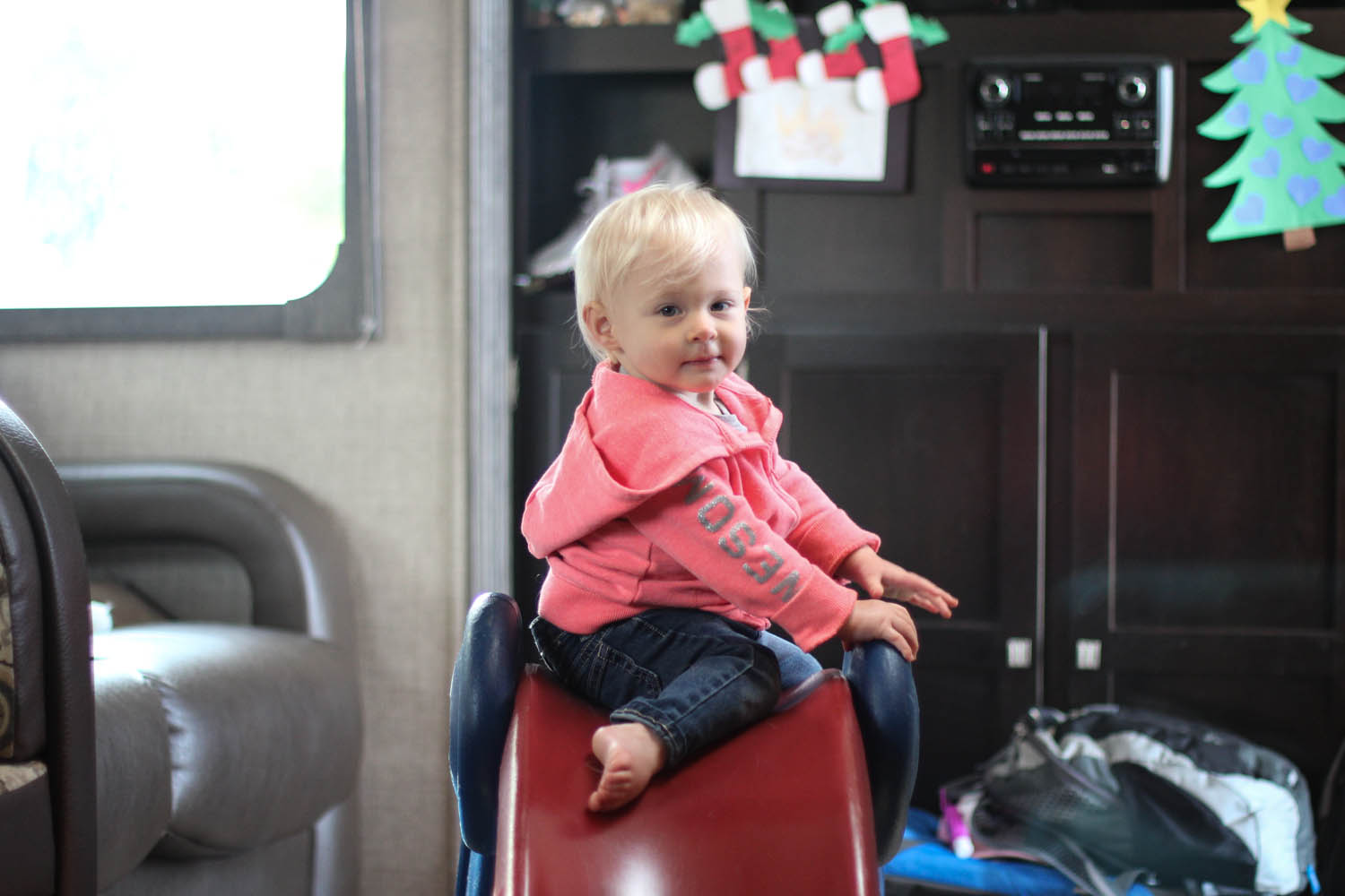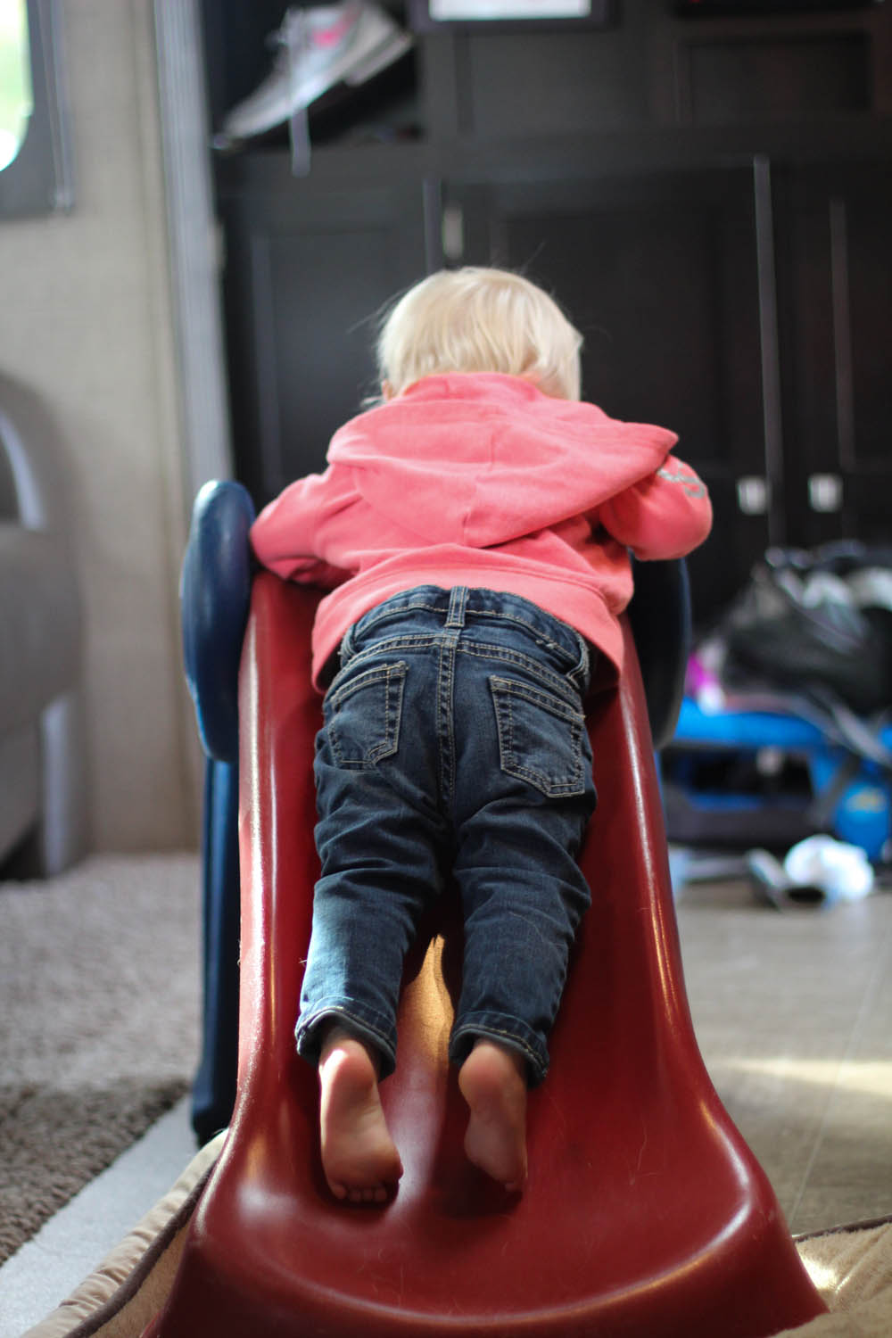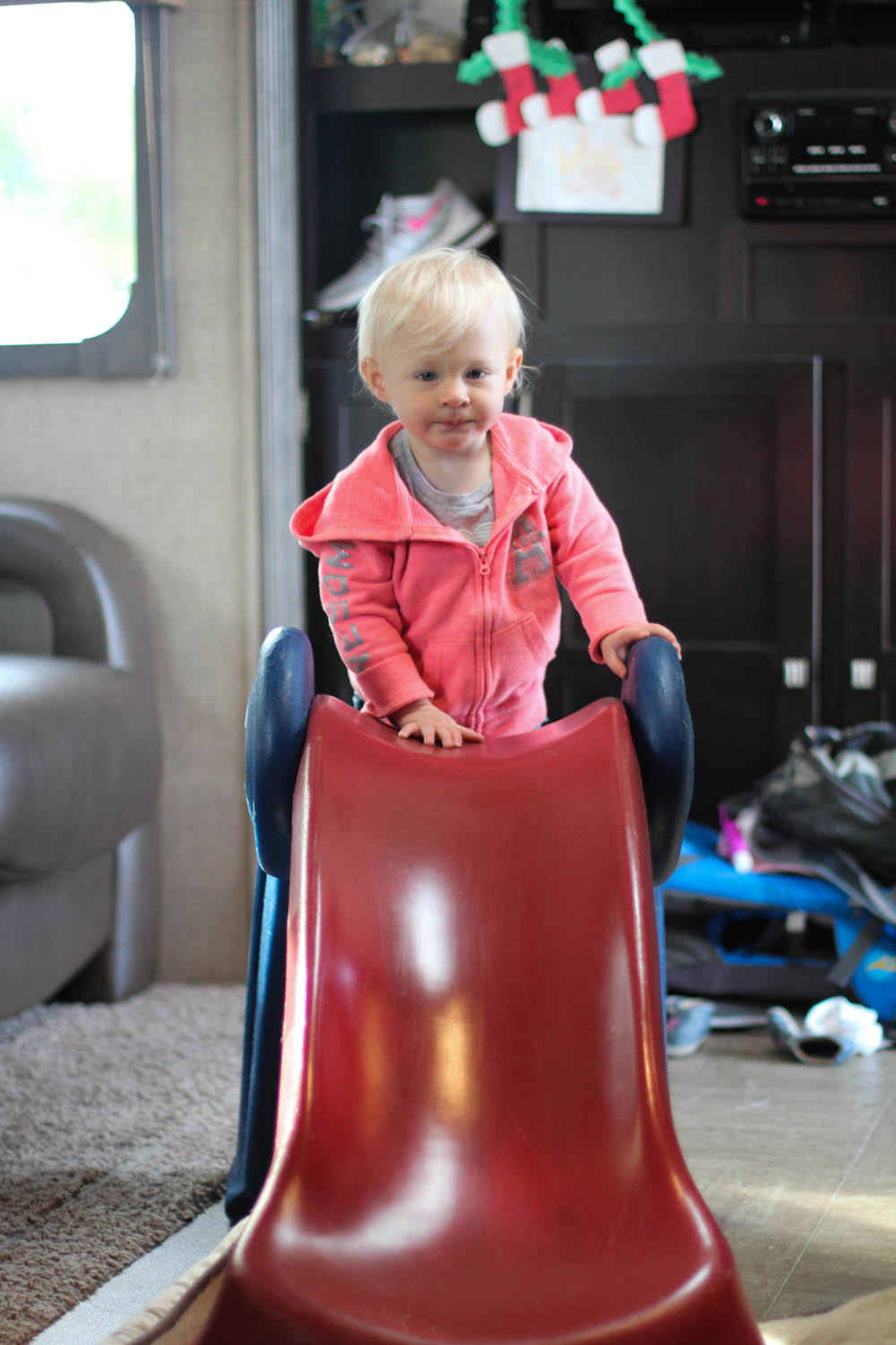 Rylie is also enjoying a sweet find from the nearby thrift store for an early Christmas gift. We picked up an awesome preloved Little Tikes indoor slide. She’s currently mastering it not only by climbing it and going down continuously, but by pushing the entire rig end to end in our trailer. $25 worth of fun. Nixon prefers to reside outside during this activity. A day ago he was happy to see her little pink jeep disappear, making his floor space safe to lounge on once again, only to discover the slide came to replace it and is much bigger.