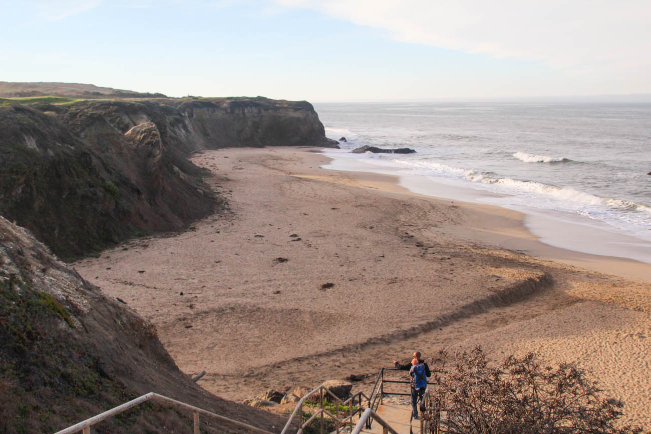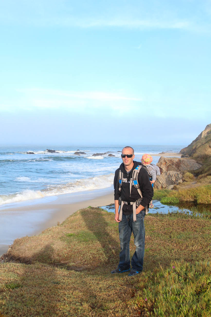In between San Fran and Monterey Bay we stayed at a nice little treed campground, just down the path from the Ritz Carlton. We stayed 1 night, went for a couple of beautiful beach walks both along the steep cliffs and down on the sand. Lucky for us we didn’t get pegged by a golf ball as the path ran right along the golf course. Nixon had some delicious fresh water running down the rocks at the beach (he had tried the ocean when a wave swept up to us and he made a great belch face), and little did I think about what else was in that water; he had the runs every two hours for half the night following. Boo.
