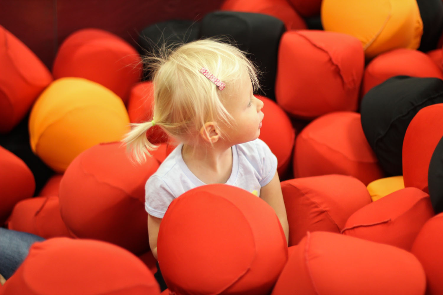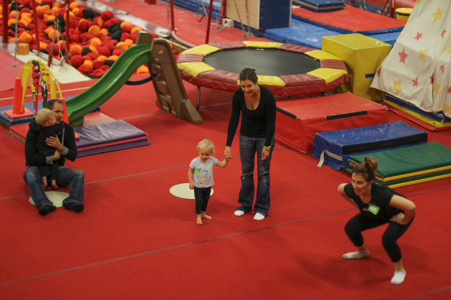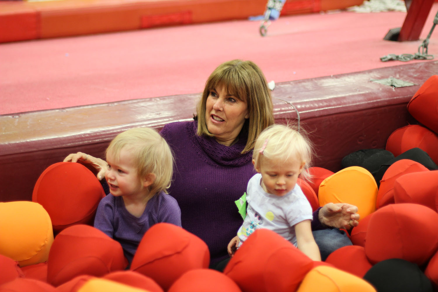Gymnastics has been a hit with Rylie in the past, but this week she was quite the cling-on, and basically I did her obstacles for her while she hung from my side like a first timer. Not sure what that was about, but I did pry her off for a few minutes during free time to play with her Gramma and favourite cousin Emma in the squishy ball pit. Dad paparazzi’d some pics during the class so as not to miss a good chance.