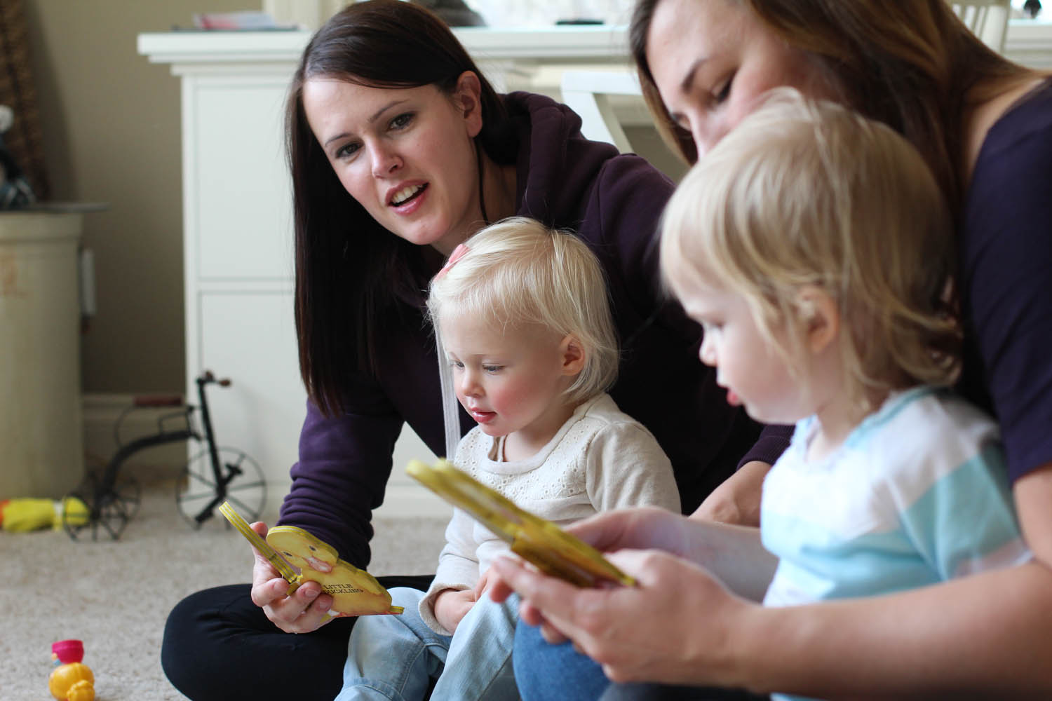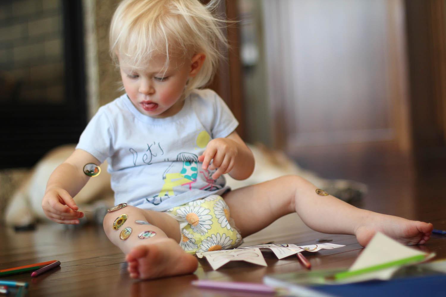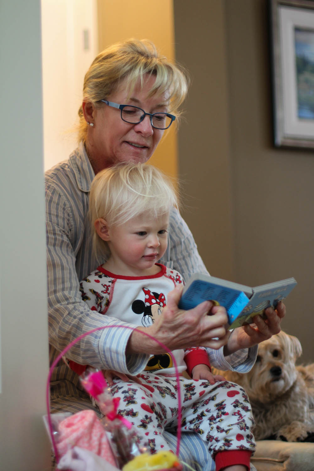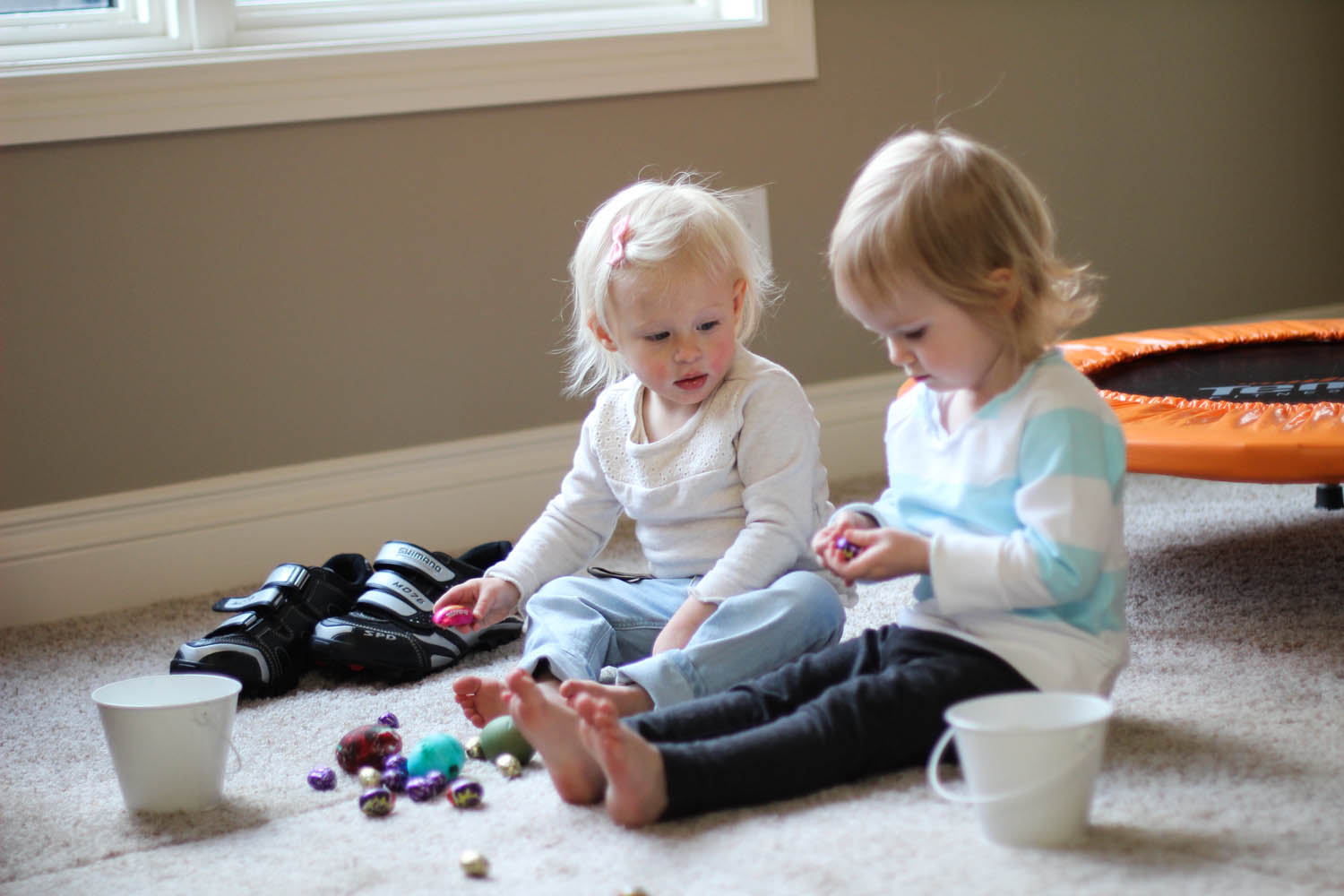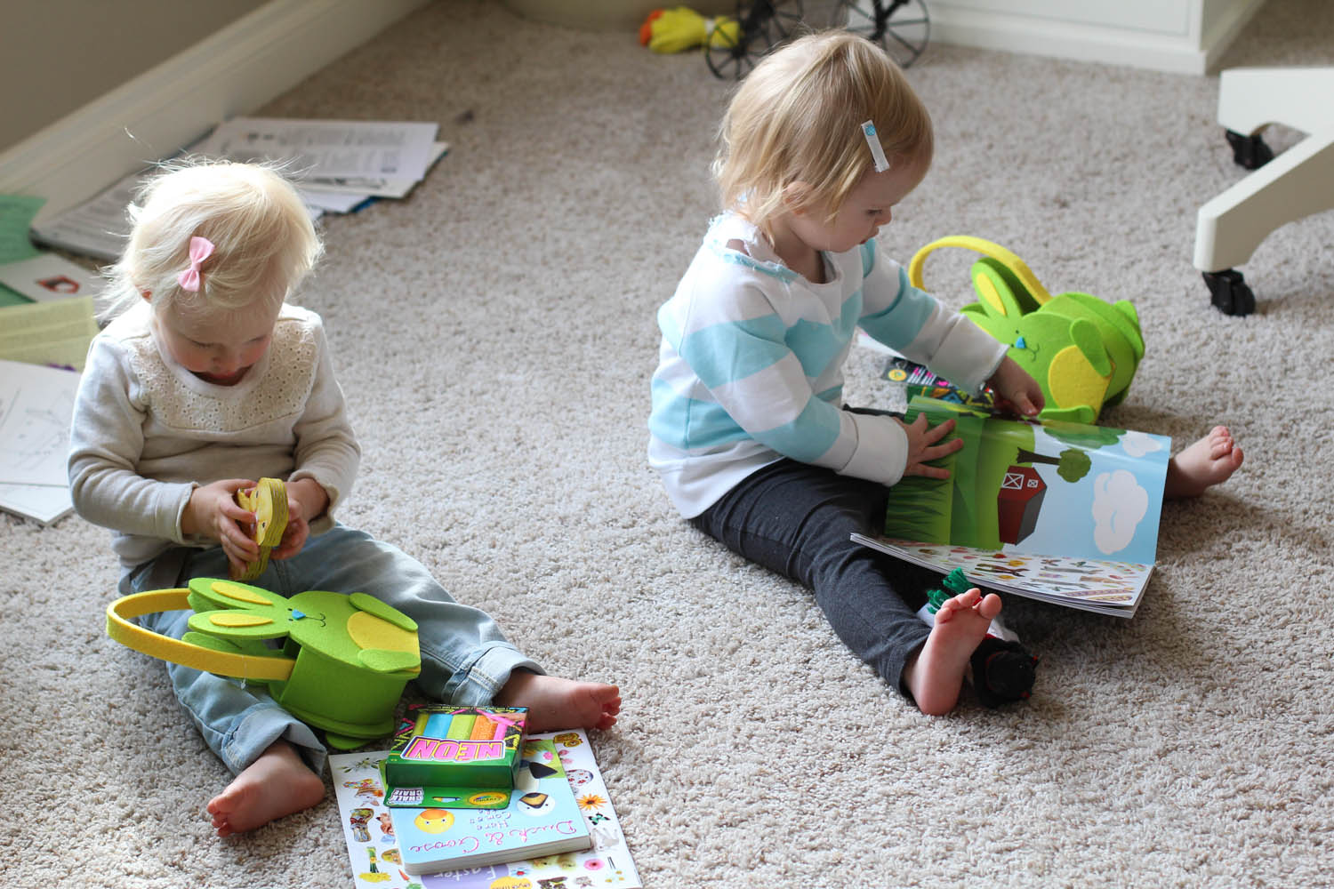 Ry’s first real easter egg hunt happened on Friday night at the grandparents house with all the aunts, uncles and her cousin. The girls had a blast with their little pails searching high and mostly low (with help from the peanut gallery) to find all the real coloured eggs that they dyed last week. Then, there were a bunch of chocolate ones, and some plastic ones filled with treats. This search kept them busy for a while, until they found their green bunny baskets, also full of goodies; namely stickers and books, which would surely please any toddler. They sat beside each other and sorted their loot, while onlooker aunties helped to read the new books and peel off stickers to paste on any body part they saw fit; even belly buttons were game. They were Hoppy Easter Babies.