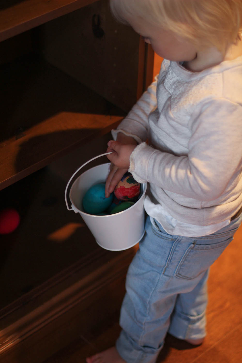 Easter Sunday was my birthday, and we started with another egg hunt. After finding and gathering 8 plastic eggs (leaving all m&m’s inside undiscovered, phew), she spotted the big basket complete with more stickers and a book, and some free floating mini eggs, which were a precursor to a breakfast of champions.