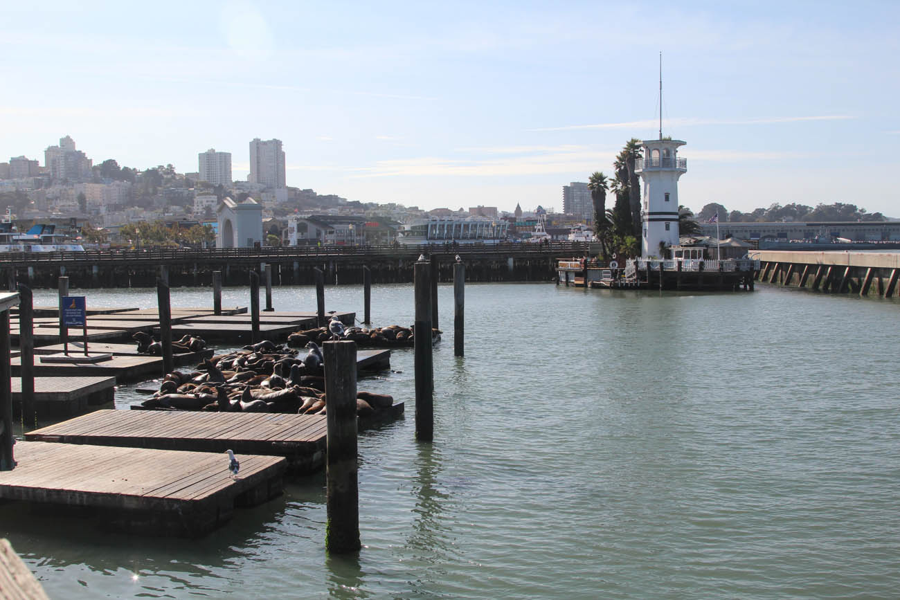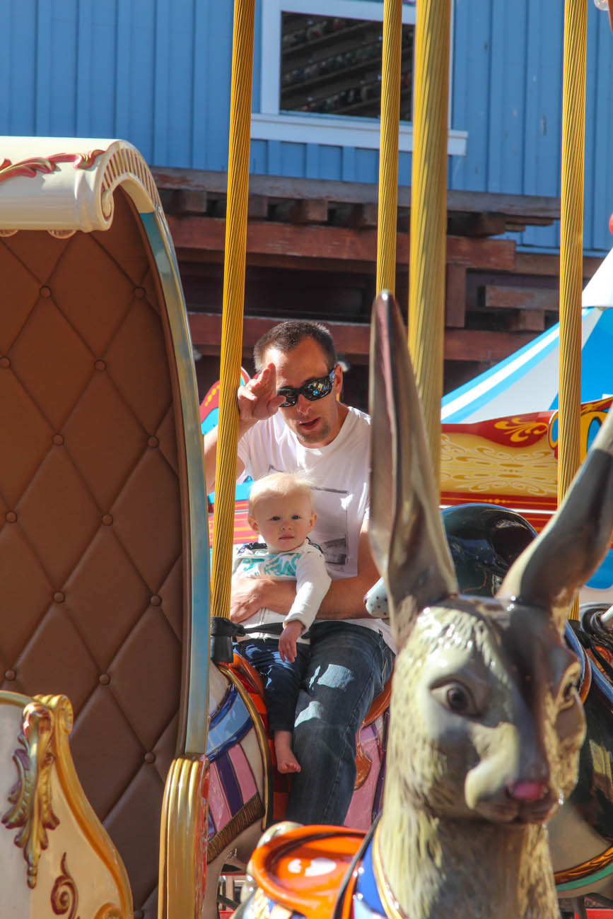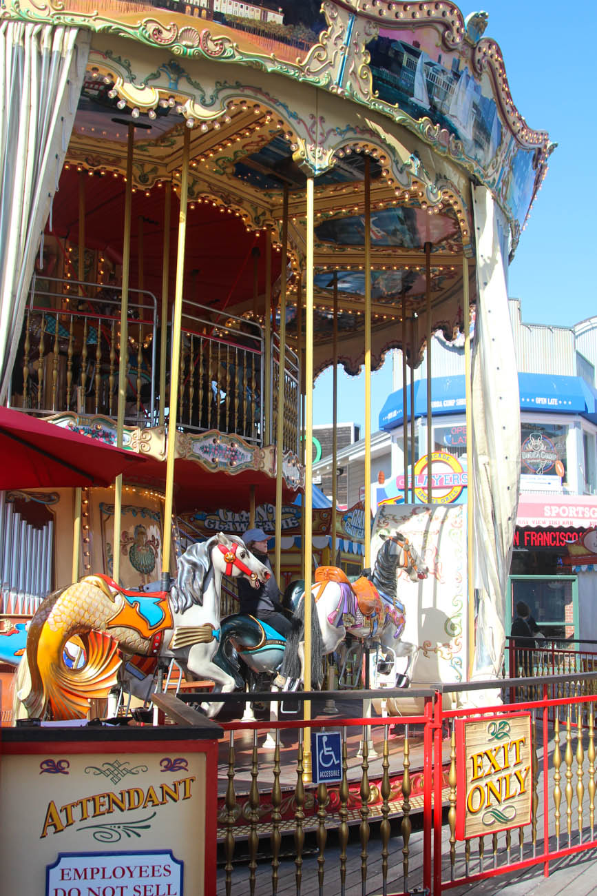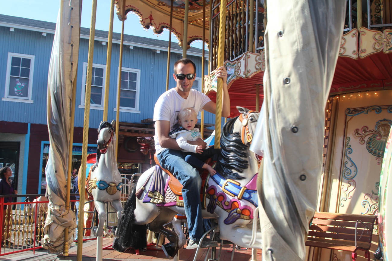 Once we arrived in San Francisco, our first stop was food. A sushi bento box, a coffee and a scone. Quick, and right at the terminal. Gone are the days of a nice sit down meal in a cafe somewhere, or if we do choose that, that’s it for the outing. We wandered through the neat little market shops and out onto the Embarcadero where we went from Pier 1 to… 39. It took a while, but the sun was shining and it was a nice stroll. We made it to the Fisherman’s Wharf just in time to hear displeasure with a certain stroller occupant. To the carousel, we heard squeals of delight, then off to the Sea Lions (more squeals), and to take pictures of Alcatraz from the pier.