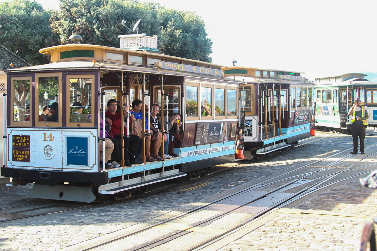 From there we followed the tacky tourist streets around to the Powell Hyde Cable Car stop which was fairly busy, but got worse as we stood in line for about 10-15 min. That was a neat experience, with such steep hills it was a challenge to stay in your seat without sliding sideways, especially while holding a squirmy baby. Unfortunately the photo ops were limited, to none, and we didn’t get to sit facing outwards as those seats were also few and far between.