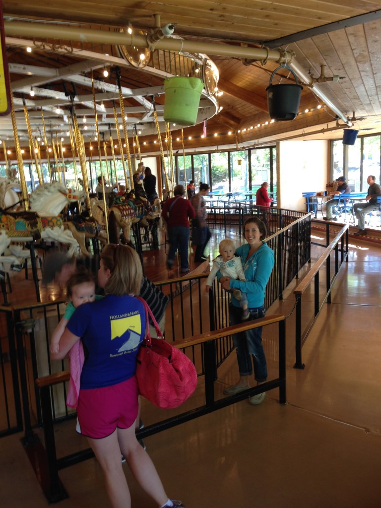 The sleeping situation has been sub-par with mulit-night wake ups due to hatred for the new playpen placed in lower bunk cave scenario. Hopefully this improves soon, as getting up at 5 with a screaming baby is probably not favourable for the neighbours for long. Nap time was at 7:30 with a crankster like that! Then, around 10 we headed downtown to check out the amusement park. It was similar to Eau Clair Market, downtown Calgary, just along the river. The Carousel was a huge hit with the little one as she has recently taken a liking to “ponies”. She squealed with delight was we went round and round at high speed. Ok, we must be old, it seemed really fast, for a Carousel. A couple of families were feeding ducks at the river shore, also a big hit. And, the highlight for dad was the GIANT radio flyer wagon slide that was situated just off the bank. It was a quick visit there, as both the water crazy lab and the baby wanted to participate in river-related activities. She to chase the ducks, he to swim laps.