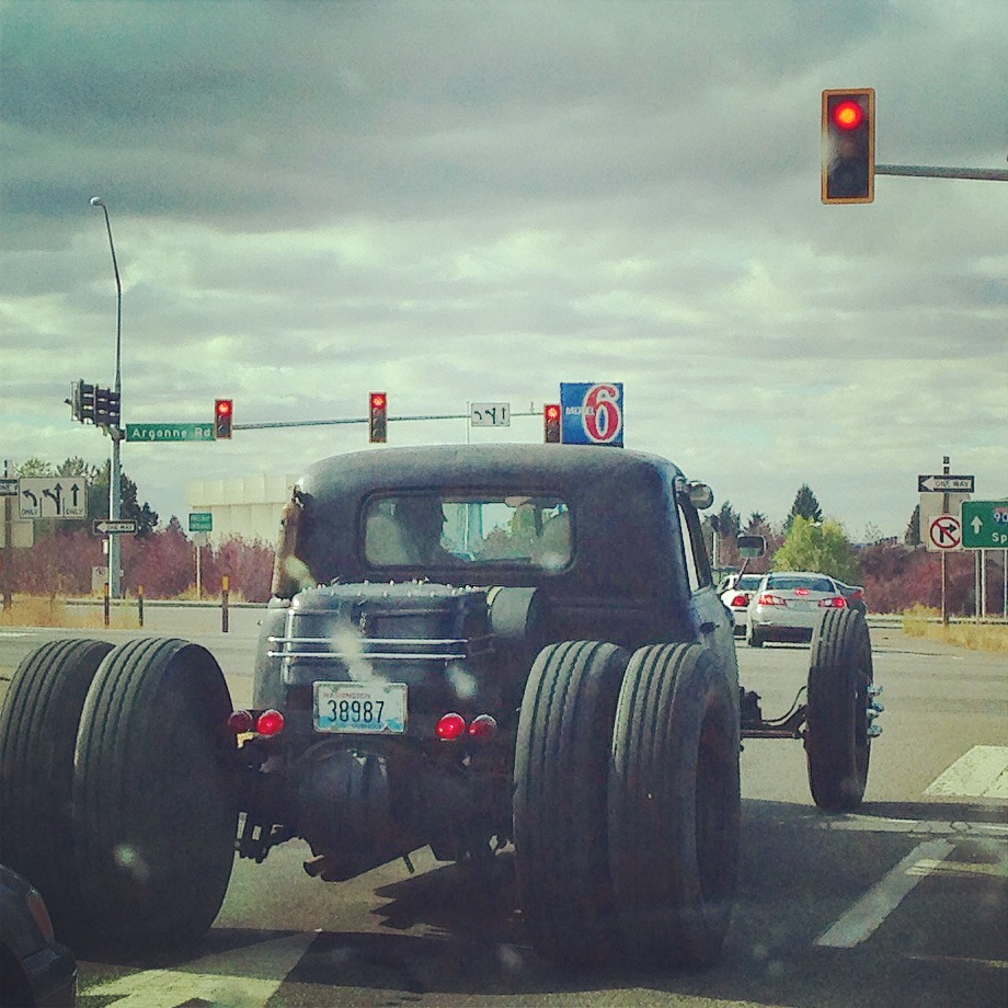 Day two of our snail paced journey took us from Sandpoint Idaho to Spokane Washington. We said “so long” to our first stop at Hi-dee-ho Campground. It was spitting rain, with puddles abound, but we needed to walk Nixon, and Josh figured a jaunt to the Golden Arches for coffee might be an order, so we walked the short half block. Yes, half block. The campground was in the centre of town, between a grocery store and an RV store. Just outside a lady was getting out of her camper van, and commented on Nixons’ harness and how it wasn’t meant for pulling. Things started out friendly & casual, but progressed to her talking about how he could pull 35 lbs of food for us to eat when we were living in the bushes, and if all else failed we could eat him, so we should keep him around and train him to pull. He could last another 10 years, even though he is nearly 10. Because that is what the world is coming to, she said. Then, as the topic went from casual to crazy, I bid her good morning. Wow.