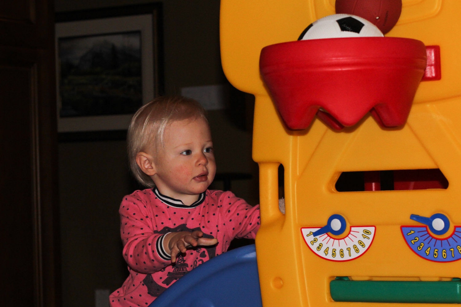 Once complete, we set it up in the great room and waited until the morning to show Ry. I think her face says it all. A big smile and that pointer finger, she was so stoked. We resisted the idea of purchasing these large toddler items, but we may be breaking. They’re a lot of fun, and great occupiers of time.