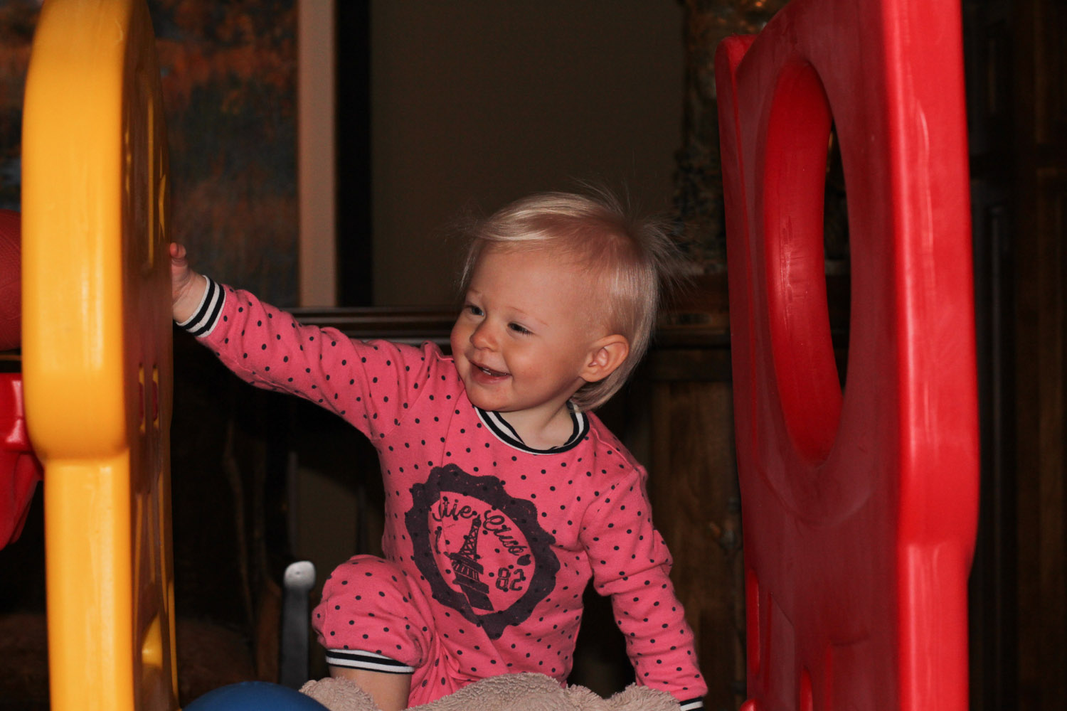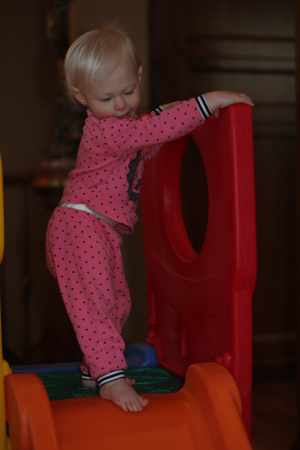 Ry is really enjoying the slide/climbing wall, showing off her skills almost immediately. This included climbing the wall, standing on top, clapping with excitement as she looked over the edge, and sliding on her belly feet first down the slide. She’s showing a lot of confidence with her ability, but still not walking.