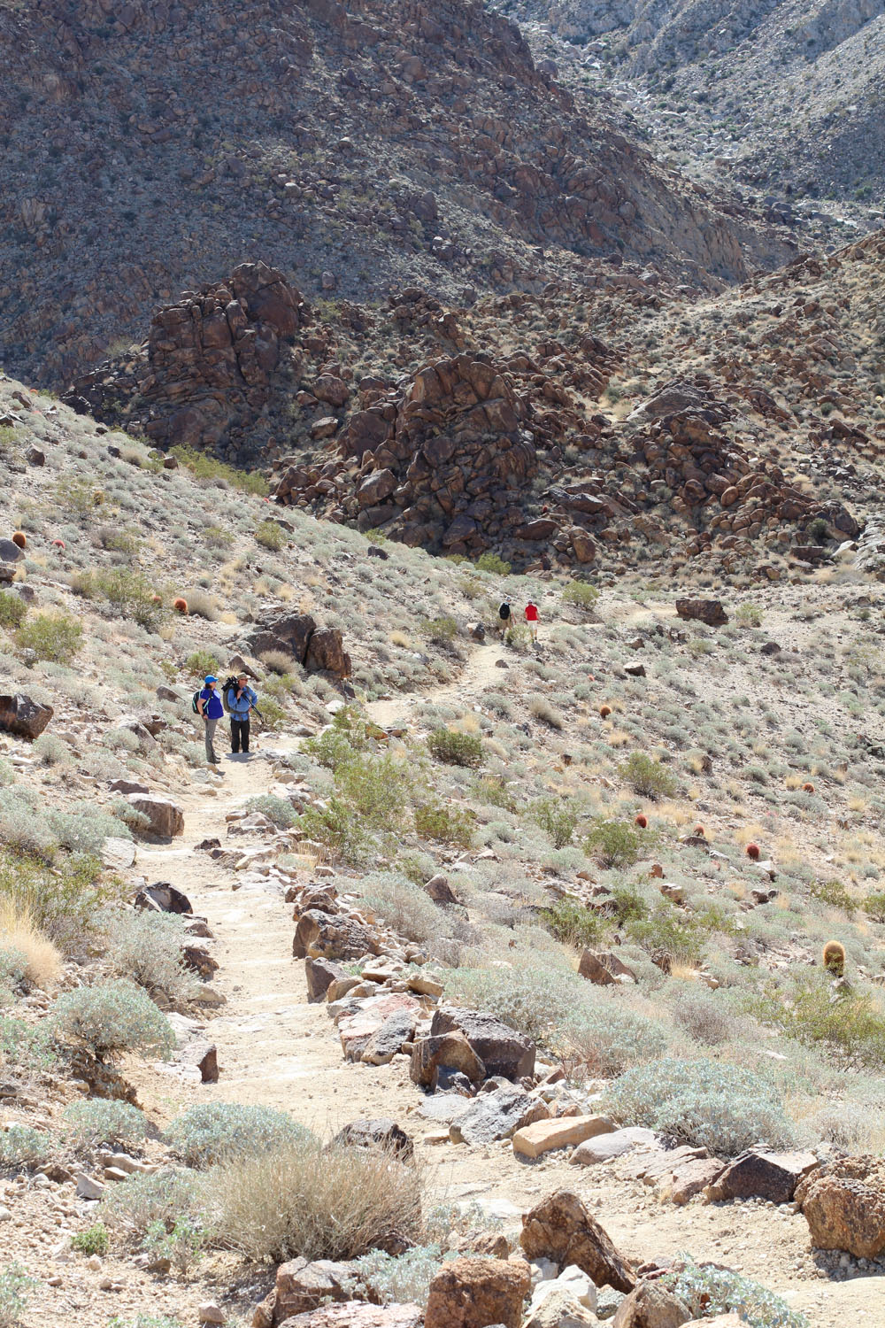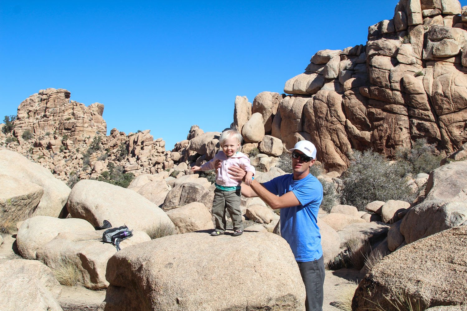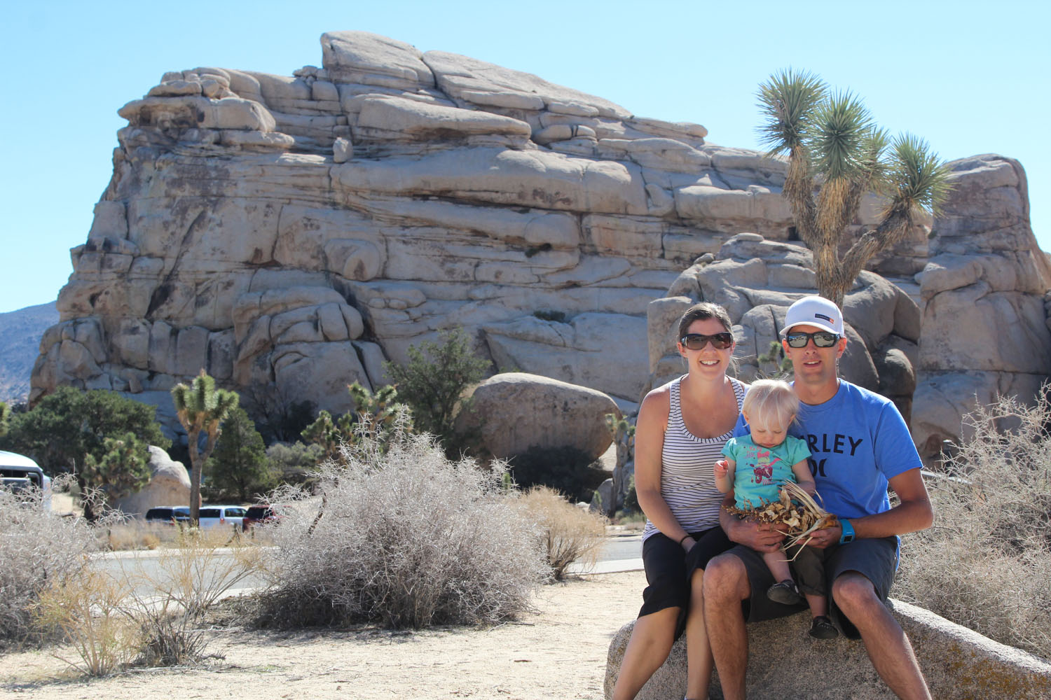 Why did we come here you ask? To see Joshua Tree National Park, of course. Which is very beautiful, in its own desert way, and so different from anything we’d really seen before. On our first day of hiking we did the 29 Palms Oasis which is a 3 mile round trip up a mountain, down the other side and into a cool gully lined with palm trees. I always thought an oasis was like a mirage, it didn’t exist, but we saw it with our own eyes. Josh carried Rylie for the whole journey, and lucky for us it wasn’t too hot, and she was a good sport about being in the backpack for nearly 2 hours. She also briefly fell asleep in the most awkward cockeyed position, with head falling out to the side with her face up. Once again she was popular on the trail as the “youngest hiker we’ve seen!” and “oh, there’s a real baby in there!” (which is my personal favourite).